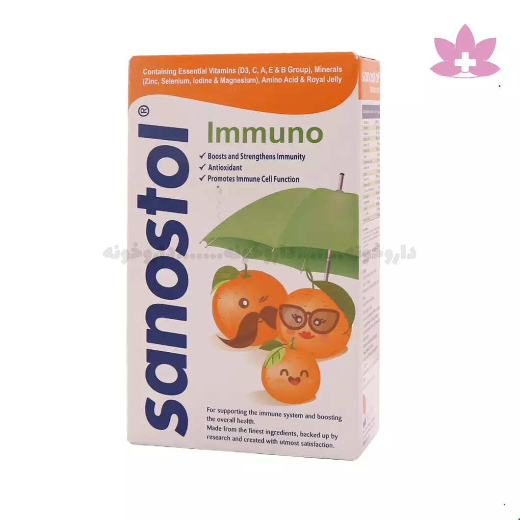 شربت ایمونو سانستول حاوی ویتامین‌های ضروری (D، A، E، C و گروه B) و مواد معدنی، اسید آمینه و از همه مهم‌تر ژل رویال است که تقویت سیستم ایمنی و بهبود سلامت عمومی بدن را به دنبال دارد.